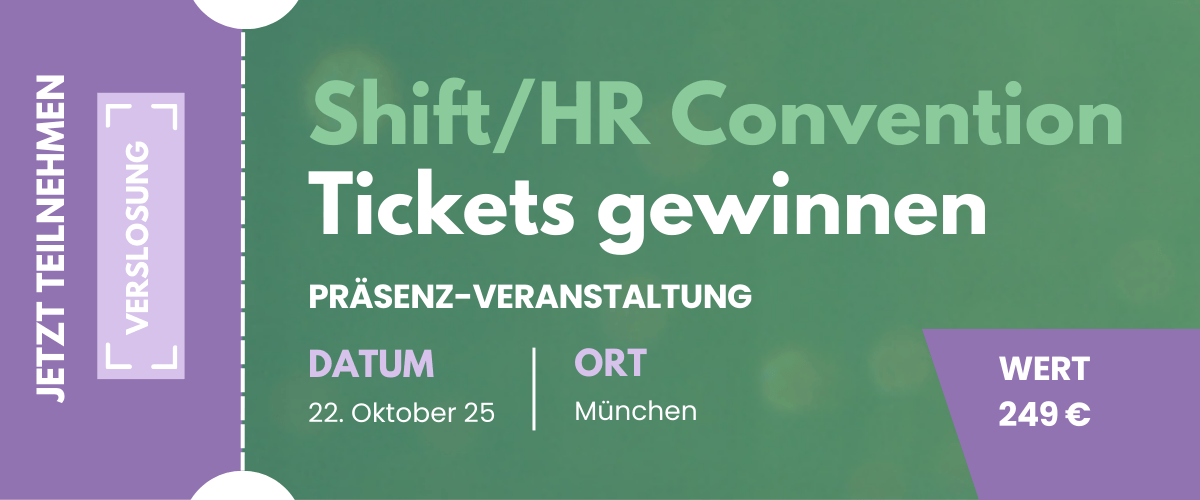 Teilnahmebedingungen: Bis 28.09.2025 um 23:59 Uhr eine E-Mail an verlosung@persoblogger.de senden mit dem Betreff: "Shift/HR Convention" und einem Satz, warum Sie ein Ticket erhalten möchten. Bei mehr als fünf Teilnehmenden erfolgt eine Verlosung. Der Rechtsweg ist ausgeschlossen. |
