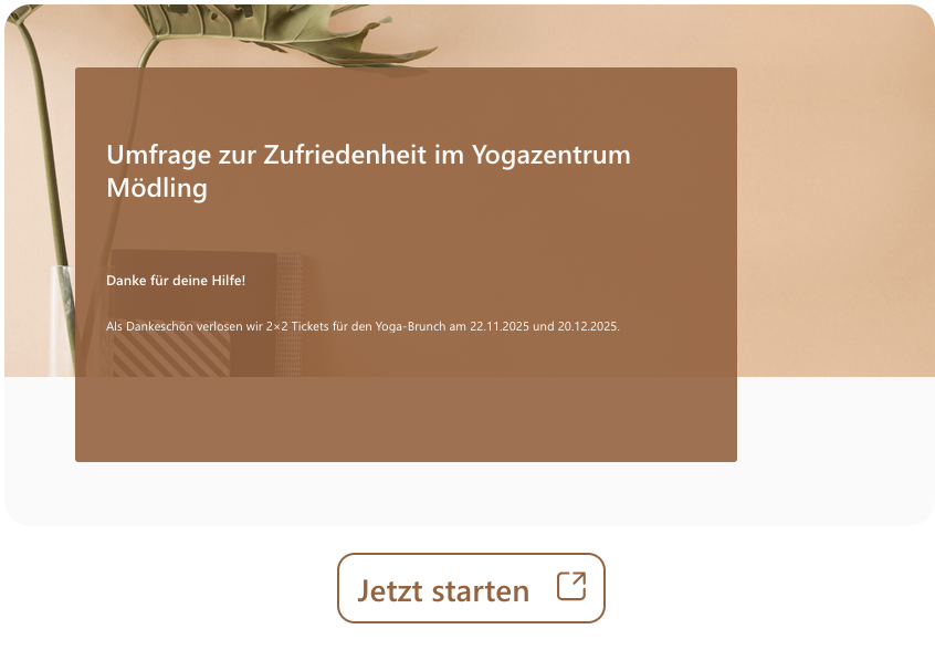 wir möchten unser Angebot noch stimmiger für dich machen – dafür bitten wir kurz um deine Unterstützung. Magst du uns in einer kleinen Umfrage sagen, was dir wichtig ist? Das hilft uns, Klassen, Workshops & Events genau auf euch abzustimmen.