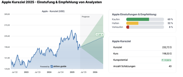 China als Zünglein an der WaageIm Aktien.Guide* gibt es bei den Aktien den Reiter „Analysten“. Ein Blick auf die Apple-Aktie zeigt, dass die Bewertungen dort eher zurückhaltend sind. Niemand kann genau sagen, wie sich die Zölle auf die zukünftigen iPhone-Preise, den allgemeinen Absatz oder speziell die iPhone-Verkäufe in China auswirken werden. Dabei ist China für Apple ein sehr wichtiger Markt. |