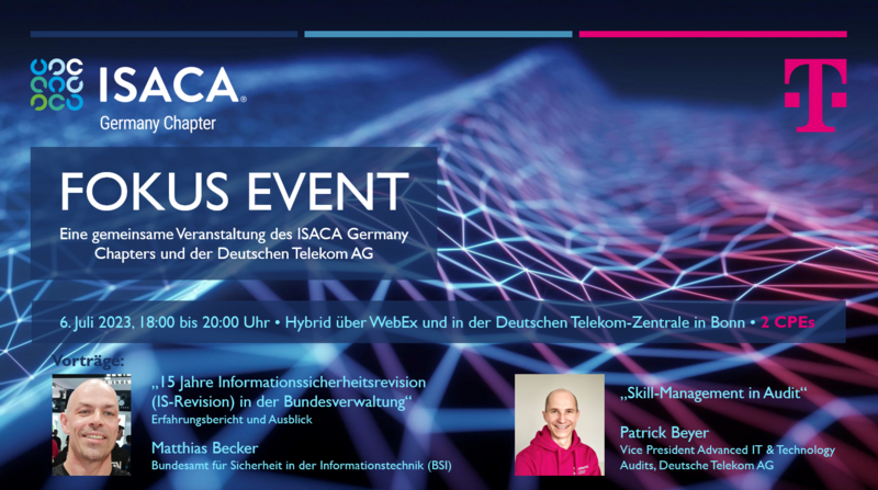 The ISACA Germany Chapter invites you to a joint focus event with Deutsche Telekom on 6 July 2023 from 18:00 to 20:00. The event will take place at the headquarters of Deutsche Telekom AG in Bonn. Online participation is also possible.
