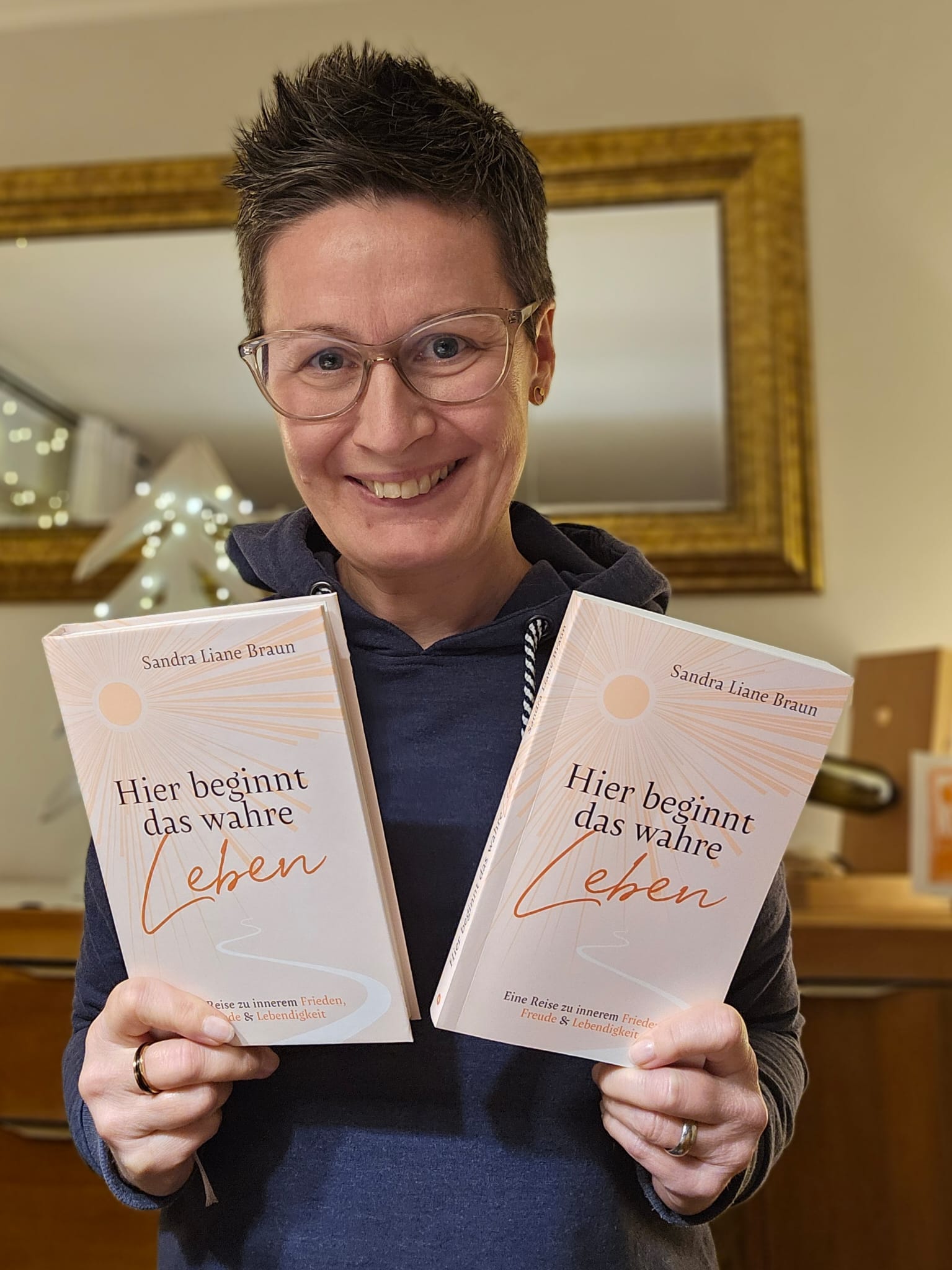 Ich halte mein neues Buch in meinen Händen 😊 Gerade habe ich das Taschenbuch und das gebundene Buch aus dem Paket herausgenommen, das mir eine Minute zuvor mein Mann vom Postboten übergeben hat. I am a very happy person 🤩