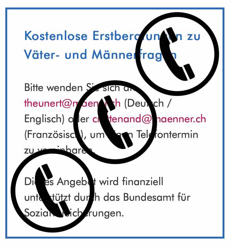 Depuis le début de l’année, maenner.ch offre grâce au soutien de l’OFAS, des entretiens brefs gratuits sur les questions relatives aux pères. Cet espace permet un partage respectueux et ouvert autour de questions relatives à la paternité. Malgré une promotion très modeste faite, la demande a été immédiate et supérieure à nos estimations. En Suisse romande, les demandes jusqu’à ce jour ont émané à 80% d’hommes et 20% de femmes. Les thèmes sont en majorité en lien avec la garde partagée non respecté par la mère. D’autres sujets ont été abordés, tels qu’une situation de paternité forcée, une autre où la mère voulait savoir que faire pour inciter le père à continuer à voir leur enfant malgré la séparation, les inégalités fiscales générées par le divorce des parents, l’obligation de servir (PC) en tant que père à charge d’enfant ou encore la difficulté pour un homme de faire vivre son couple après une PMA non aboutie.   L’approche se base sur un mixte, en fonction des besoins exprimés et dessinés ensemble parfois, entre du conseil (advising) et de l’accompagnement (councelling) dans une démarche personnelle de l’appelant.e. Très souvent, les personnes sont orientées vers d’autres ressources envisageables. Les entretiens se font sur rendez-vous, par téléphone principalement, mais aussi par mail voir Zoom. Cette expérience est très enrichissante car elle permet de cerner la diversité des réalités cachées derrière une même thématique.  |