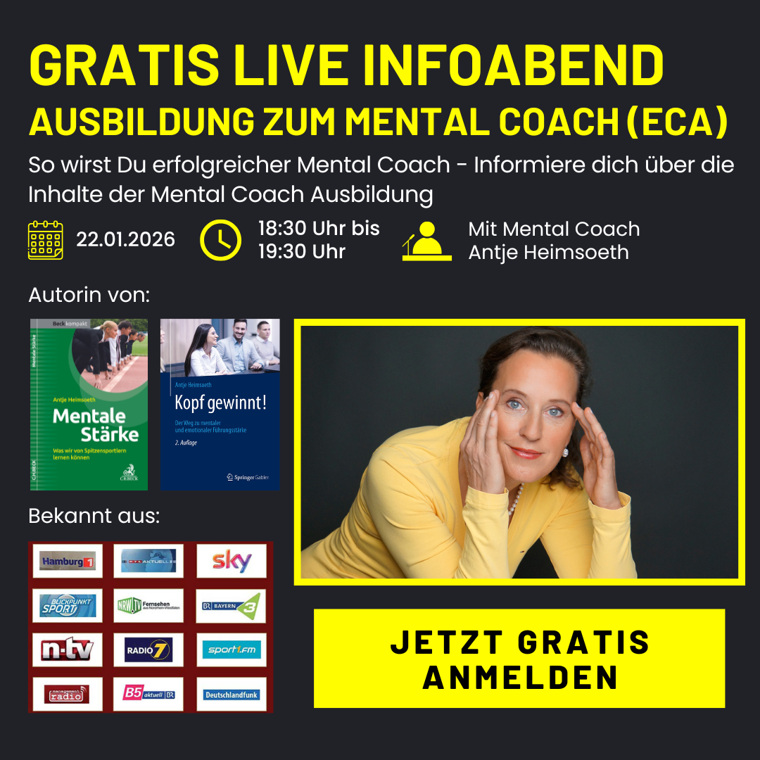 Profitieren Sie von der Expertise der „renommiertesten Motivationstrainerin Deutschlands“ (FOCUS) – sie ist seit 21 Jahren auf dem Markt - und zert. Mental- und Business Coach Antje Heimsoeth.