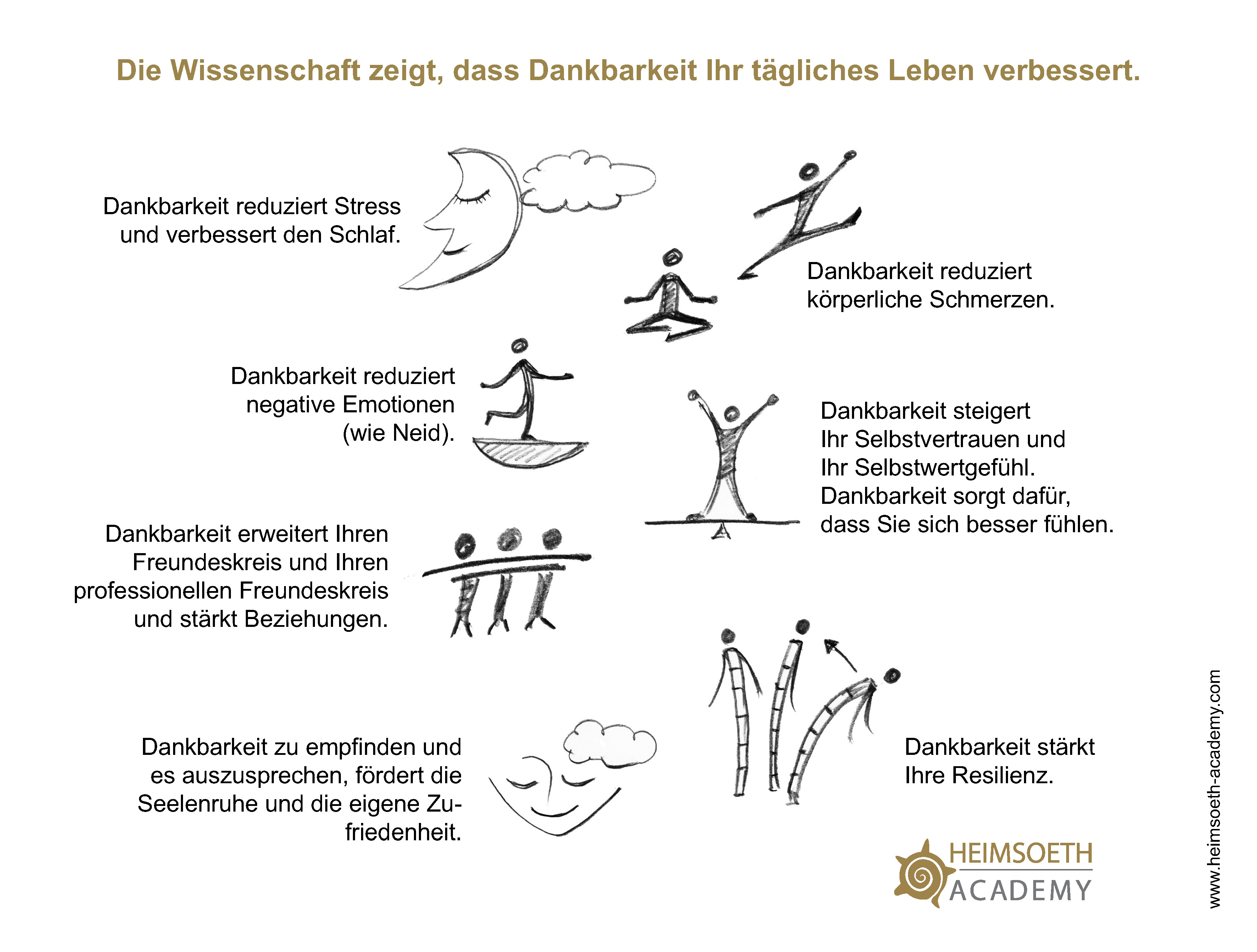 Dankbarkeit hat einen starken Einfluss auf Wohlbefinden und Gesundheit. Dankbare Menschen sind liebevoller, entspannter, schmerzfreier, gesünder und energievoller. Sie haben weniger Stress, nehmen weniger Drogen und schlafen schneller ein. Sie haben grundsätzlich eine bessere körperliche Konstitution als Menschen, die ihren Fokus vor allem auf die Dinge richten, die ungünstig in ihrem Leben laufen.