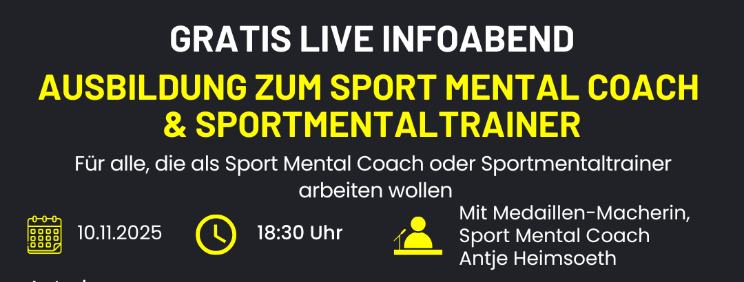 🎓 Mit wem? Ihre Mental Expertin ist Antje Heimsoeth. 2003 stieg die Heimsoeth Academy in das mentale Training und Coaching (Sport, Gesundheit, Wirtschaft, Kinder) ein. Seitdem hat Antje Heimsoeth, Gründerin und Leiterin der Heimsoeth Academy, viele internationalen Mannschaften, Olympiasieger, Nationalspieler und Athleten, Ärzte, Unternehmen und Banken sehr erfolgreich als Mental Coach begleitet. Mentale Vorbereitung div. Olympiakaderathleten auf die Olympischen Spiele 2004 (Athen), 2008 (Peking), 2012 (London), 2016 (Rio de Janeiro), 2020 (Tokio) und 2024 (Paris).