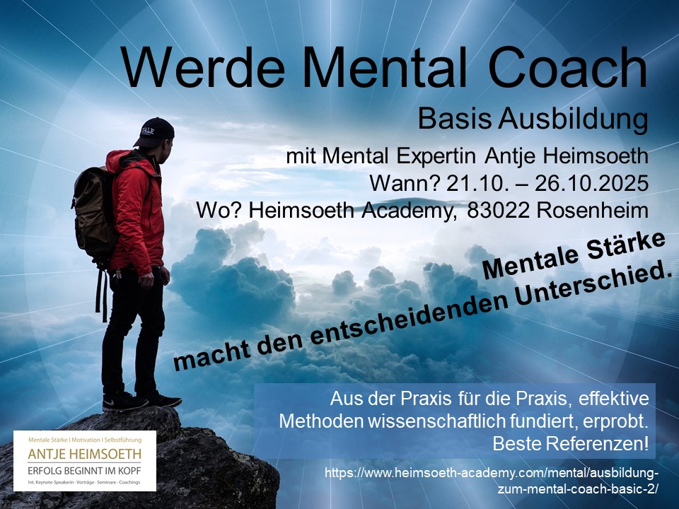 In der Basis Ausbildung zum Mental Coach erlernen Sie jede Menge Grund- und Fachwissen, mentale Techniken und Methoden für das Coachen und Trainieren von mentaler Stärke bei sich selbst und Ihren Kunden aus der Wirtschaft und dem Sport.