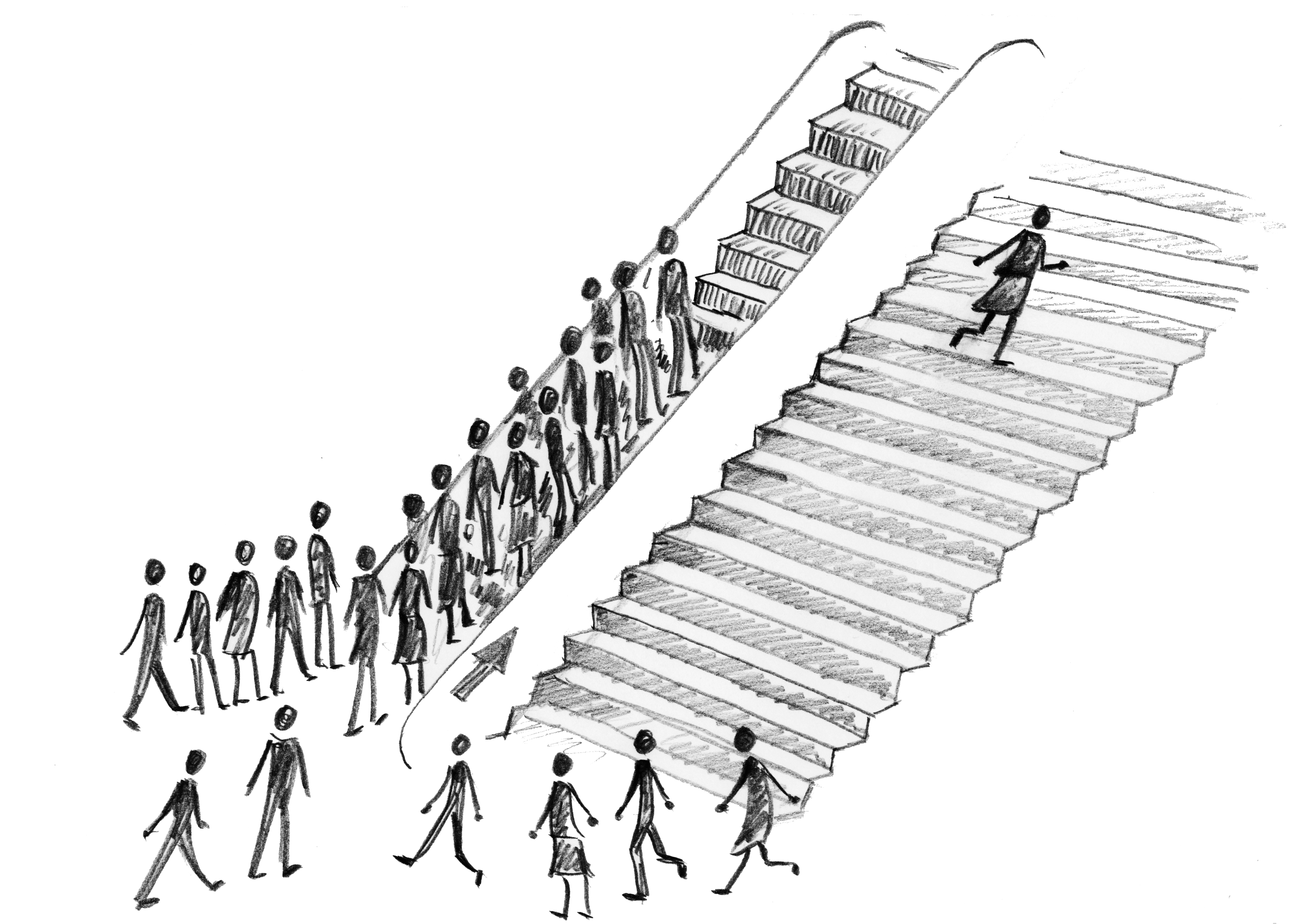 Das gilt auch für die Wirtschaft: Jede(r) hat einen Anteil am Erfolg, die Ansprache der Führungskraft Richtung Mitarbeitende ist mitentscheidend für das Erbringen herausragender Leistungen. Als Führungskraft sollten Sie sich dessen unbedingt bewusst sein. Skilanglauf-Bundestrainer Peter Schlickenrieder, der bei dieser Winterolympiade Gold für den Mannschaftssprint Frauen und Silber für die Langlaufstaffel Frauen verbuchen konnte, weiß um die Wirkung des Umfelds: „Alle im Team haben Anteil am Erfolg, selbst der, der die Deko macht, viele helfende Hände. Aber ein blöder Spruch kann einen Athleten zerstören.“ | | | | Eine Treppe und eine Rolltreppe