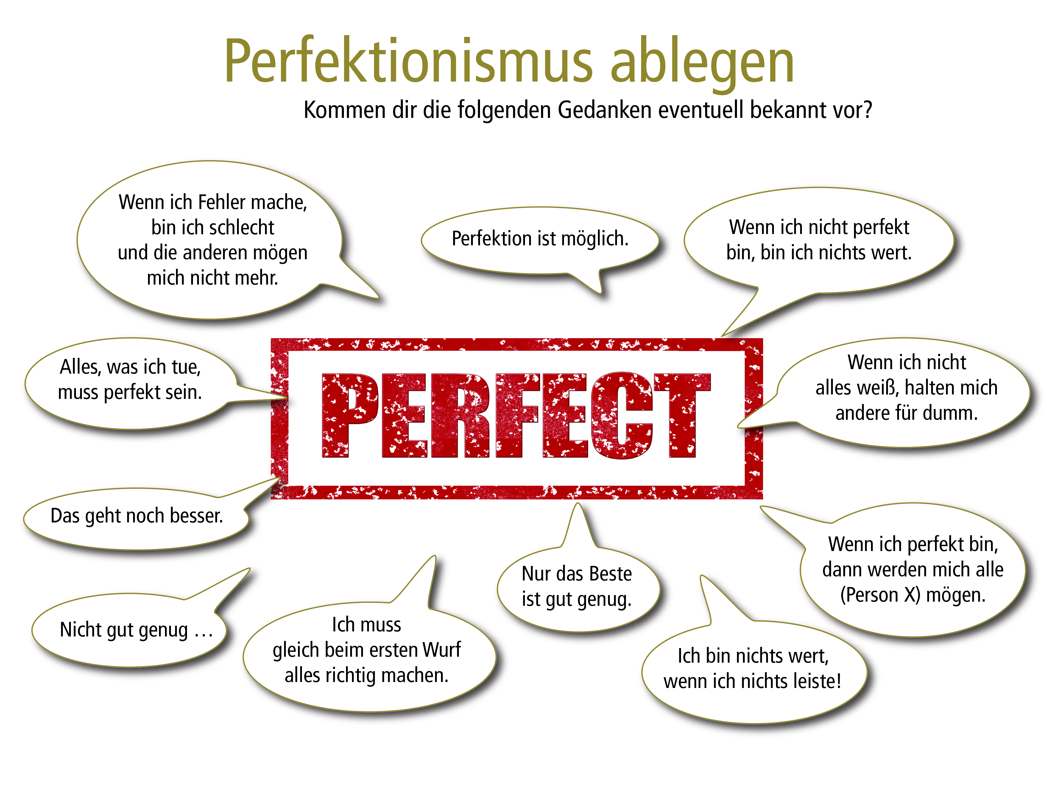 Der Perfektionismusfalle entkommen sie durch die Erkenntnis, dass sie okay sind, wie sie sind. Zu wissen, warum man alles zu 110 Prozent tun möchte, ist der erste Schritt. Der zweite ist das Hinterfragen der eigenen Werte und Entwickeln eigener Maßstäbe: was ist mir wichtig im Leben?