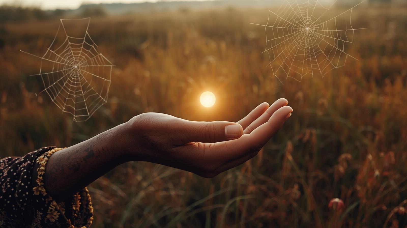 Die Tore zur Anderswelt gehen jetzt in dieser Jahreszeit immer weiter auf. Die Schleier sind dünner. Wir tauchen in die dunkle Nebelzeit ein, in der wir mehr ahnen, mehr wahrnehmen, mehr fühlen, als dass wir wirklich wissen. | | | | Was ist das Fäden-Gefühl? | Das Fäden-Gefühl kann sich auf verschiedene Arten äußern. Besonders im Oktober/November ist die Zeit der Fäden, des Spinnens, des (Neu)Webens deines Schicksals … deines weiteren Lebenswegs, indem du Altes verspinnst. Es ist der Kontakt mit der Spinnerin in dir, der sich jetzt durch das Fäden-Gefühl äußern kann. | | | Zum Beispiel, indem du Fäden wahrnimmst, als würden sie dein Gesicht berühren. Manche spürt sie auch an ihren Händen. So, als ob du gegen ein Spinnennetz gelaufen wärst – doch da war keins. Diese Art Schleier-Gefühl zeigt sich dann, wenn Ahn*innen und/oder Geistwesen anwesend sind. Du fühlst die Anderswelt als physisches Empfinden wie einen Spinnennetz-Schleier, der dein Gesicht streift. Ich nehme in solchen Zuständen auch oft Schatten wahr oder spüre die Anwesenheit von Wesen. Für alle, die damit noch keine Erfahrung haben: